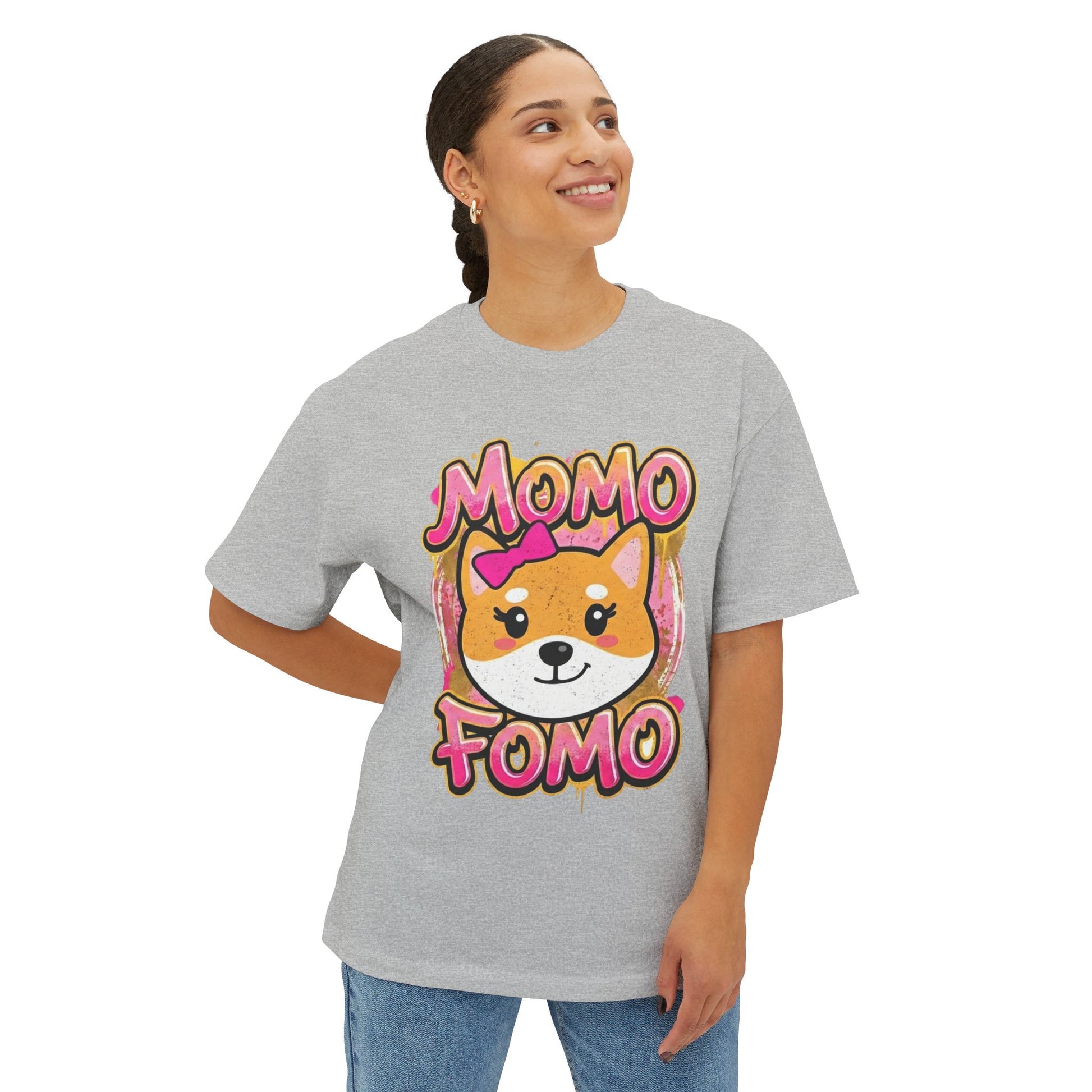 Soft, roomy, and playful — this oversized boxy tee brings a little cartoon joy to everyday wear. The front features a sweet Shiba-like pup framed by warm brushstrokes and the cheeky 'MOMO FOMO' lettering in retro bubble script. Lightweight yet substantial, the tee drapes with dropped shoulders for an effortlessly relaxed silhouette. Wear it to hang out with friends, stroll through a weekend market, or add a cute layer to your cozy days at home. The tear-away label and durable double-stitched hems mean comfort without scratchy tags and a tee that holds up wash after wash. If you love bold kawaii vibes and comfort-forward fits, this makes everyday dressing feel fun and easy.